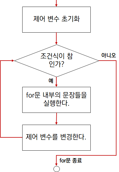 여기서 초기식이란 처음에 한 번만 실행되며, 제어 변수를 여기서 초기화합니다. 여기서 제어 변수(control variable)란 반복의 횟수를 결정짓는 변수로 반복문을 제어하는 역할을 합니다. 그리고 두 번째, 조건식은 while문의 조건식과 동일합니다. 이 조건이 거짓이 되면 루프를 빠져나옵니다. 세 번째, 증감식은 루프 탈출을 위해서 제어 변수를 증가 또는 감소시키는 등의 작업이 이곳에서 이루어집니다. 위에서 보시다시피 초기식, 조건식, 증감식은 세미콜론(;)으로 구분합니다. for문의 실행 흐름을 순서도로 나타내면 아래와 같습니다.