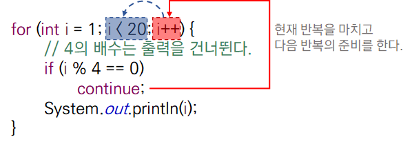 코드를 살펴봅시다. 5행의 조건을 만족하면 6행의 continue문이 실행됩니다. 즉 'i를 4로 나눈 뒤에 나머지가 0이라면 continue문을 실행한다.'란 말이 됩니다. 흐름을 살펴보면 i의 값이 차례대로 증가하다가 4가 되는 순간 5행의 조건식이 참이 되므로 continue문을 실행하게 됩니다.