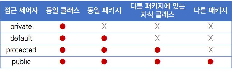 - protected: 동일 패키지 혹은 다른 패키지에 있는 자식 클래스에서만 접근할 수 있습니다.