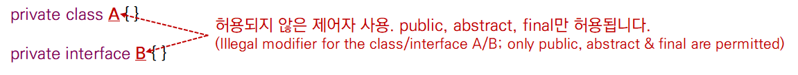 private 접근 제어자는 클래스와 인터페이스에 사용할 수 없습니다. 외부에서 접근할 수 없는 클래스나 인터페이스는 쓸모가 없기 때문입니다. 클래스나 인터페이스에 private 접근 제어자를 붙이면 아래와 같은 에러를 볼 수 있습니다.