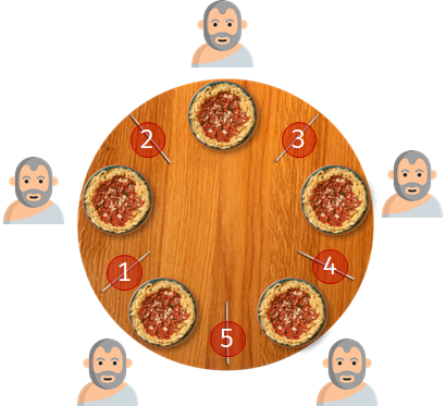 식사하는 철학자들 문제는 컴퓨터 과학에서 데드락을 설명하기 위해서 자주 등장하는 문제입니다. 식당의 한 가운데에는 의자 5개가 놓인 원형 테이블이 있으며 각 의자에는 철학자가 한 명씩 앉아있습니다. 철학자는 서로 말을 할 수 없습니다. 각 철학자의 앞에는 스파게티가 놓인 접시가 있으며, 철학자들 사이에는 젓가락이 하나씩 있습니다. 철학자는 각자 깊은 사색에 빠져 있으며, 배가 고프면 잠시 생각을 멈추고 좌우에 있는 젓가락을 집어들어 스파게티를 먹을 수 있습니다. 젓가락을 집어들 때, 좌우에 있는 젓가락을 동시에 들 수 없으며 한 번에 하나의 젓가락만 들 수 있습니다. 식사가 끝나면 젓가락을 내려놓고 다시 생각하기 시작합니다.