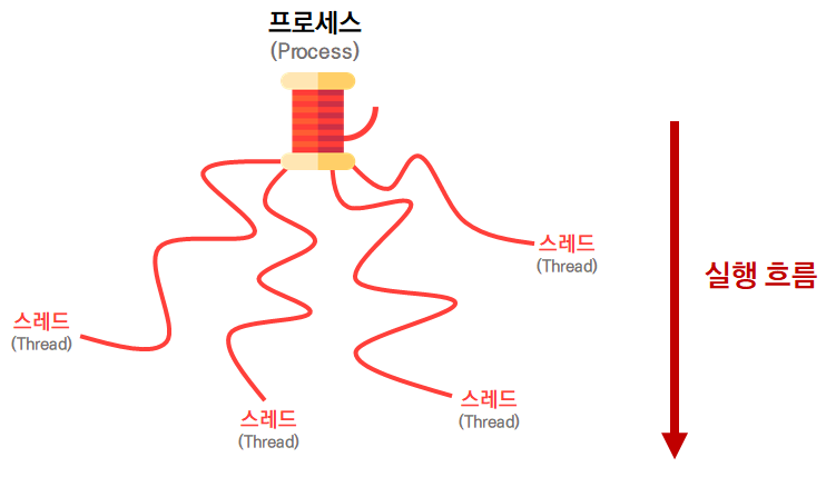 스레드(thread)의 사전적 정의를 살펴보면 '실, 가닥'이라는 것을 알 수 있는데, 컴퓨터 세계에서 스레드를 떠올리면 아래와 같은 이미지일 것입니다. 여기서 프로세스는 간단히 말하면 실행 중인 프로그램을 말합니다.
