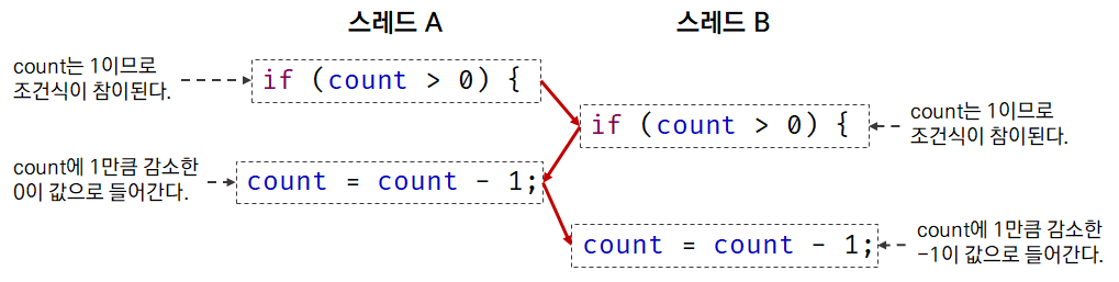 둘 이상의 스레드가 공유 자원인 count에 동시에 접근하려고 할 때 경쟁 상태가 발생하므로 이를 막기 위해선 크리티컬 섹션을 표시해야 합니다. 이런 크리티컬 섹션을 표시하는 방법 중 하나로 synchronized 키워드를 사용할 수 있습니다.