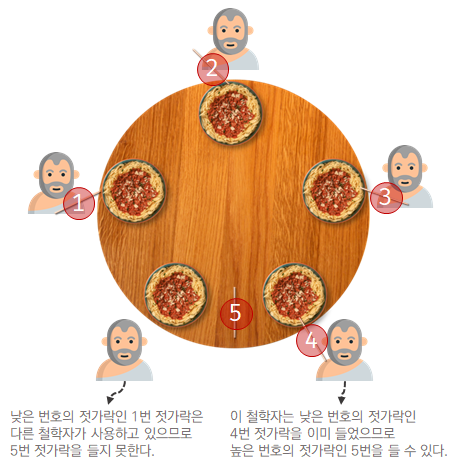 이렇게 하면 5명 중 4명의 철학자가 동시에 낮은 번호의 젓가락을 집는다고 하더라도 가장 높은 번호의 젓가락이 남기 때문에, 젓가락을 집은 4명의 철학자 중 한 명은 두개의 젓가락을 집을 수 있게되어 음식을 먹을 수 있습니다.