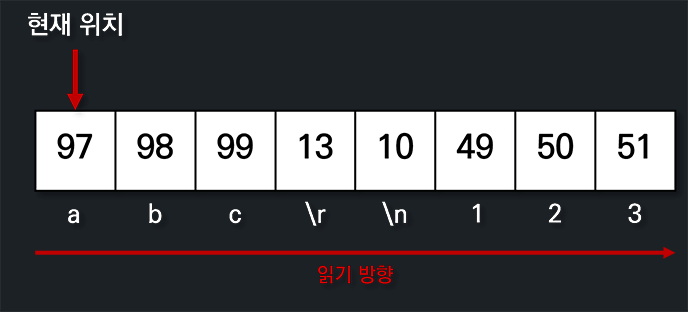 여기서 하나 신경쓰이는 것이 있는데 개행이 \n가 아니라 \r\n이라는 것입니다. 보통 다른 운영체제(맥, 리눅스 등)에서는 \n을 개행으로 사용하지만, 윈도우에서는 \r\n이 개행으로 자주 사용됩니다. 그러니 이를 하나로 묶어서 개행 문자로 바라봅시다.