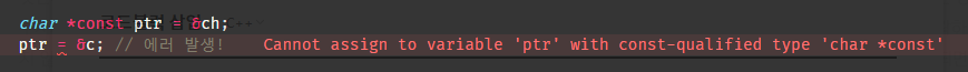 'Cannot assign to variable 'ptr' with const-qualified type 'char *const'(const로 한정된 char *const 타입인 변수 ptr에 할당할 수 없습니다)'라는 에러가 발생하는 것을 볼 수 있습니다. 이는 위에서 말한 그대로 포인터 변수 ptr의 상수화가 이루어져있으며, 즉 포인터 변수 ptr에 저장된 주소값을 변경하지 못합니다. 아래 코드도 한번 컴파일해볼까요?