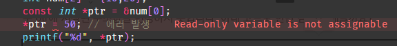 말 그대로 읽기 전용 변수에 할당할 수 없다는 내용입니다. 즉, 5행에서 선언한 const 선언은 포인터를 이용한 값의 변경을 허용하지 않겠다는 소리입니다. 그렇지만 num[0]을 통한 값의 변경은 가능합니다. 아래의 경우는 또 어떨까요?