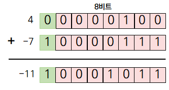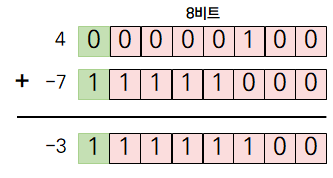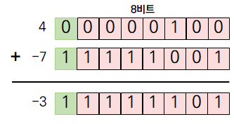 2의 보수를 이용해 4와 -7을 서로 더하면 아래와 같습니다.