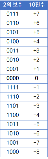 아래 표에서 확인할 수 있듯이 부호 절댓값 방식과 1의 보수에서 양의 0과 음의 0이 존재하는 문제가 해결되었음을 볼 수 있습니다.