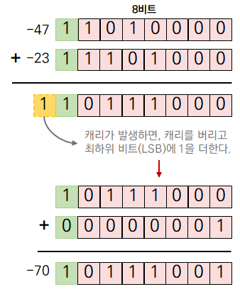 연산 시 캐리가 발생했을 때는 추가적인 연산이 필요합니다. 캐리는 최상위 비트(MSB)에서 그 위의 비트로 자리올림이 발생하는 것을 말합니다.