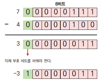 부호 절댓값 방식에선 4+(-7)은 아래와 같이 -(7-4)로 계산해야 합니다.