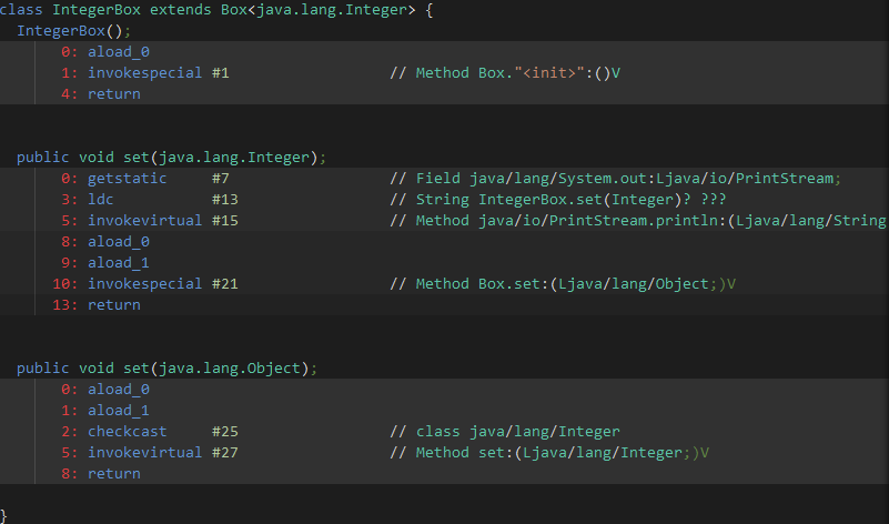 따라서 컴파일러는 아래와 같이 Box.set(Object)와 IntegerBox.set(Integer)를 잇는 브리지 메서드를 만들어서 다형성을 유지할 수 있도록 해줍니다.