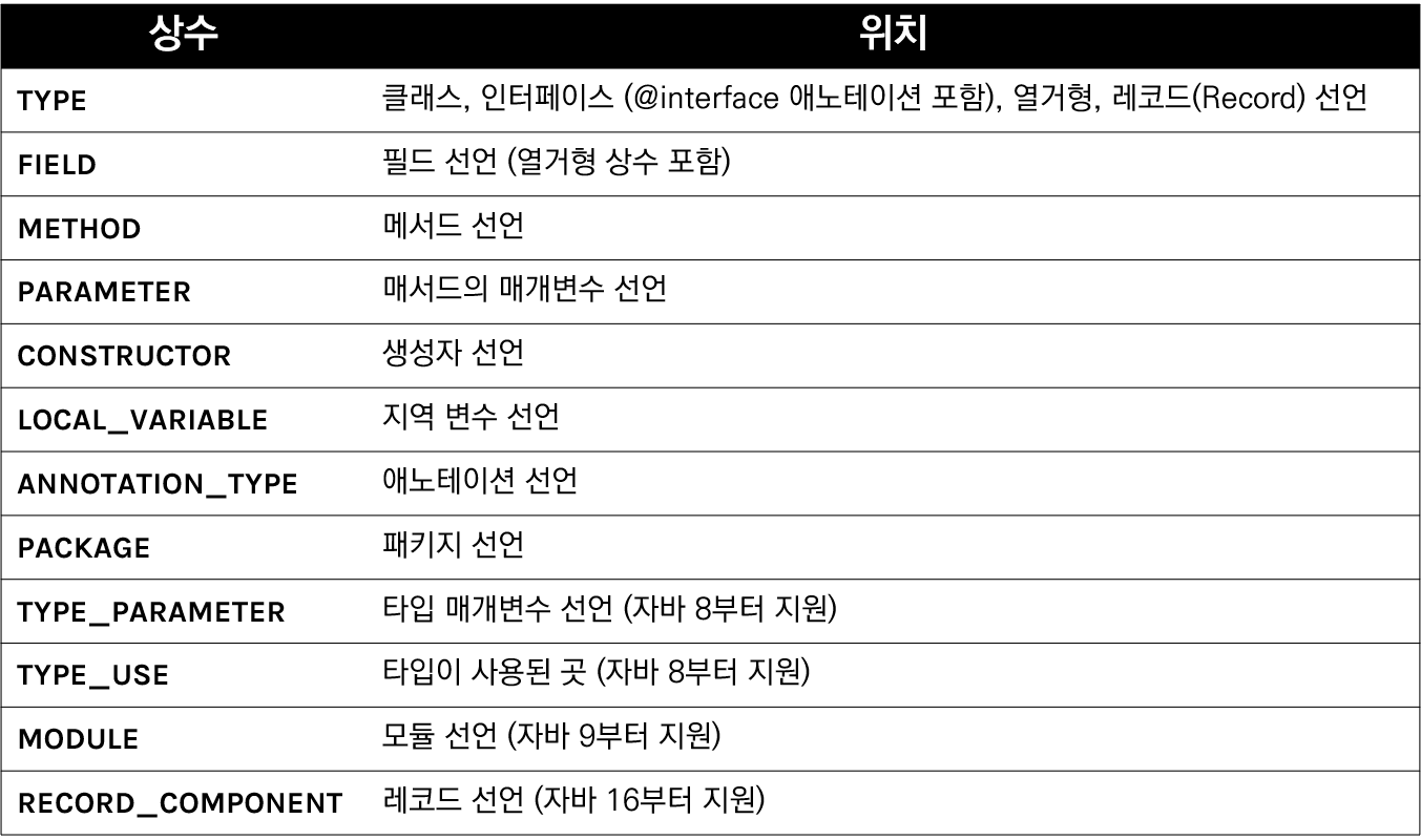 말 그대로 애노테이션을 사용할 수 있는 대상(target)입니다. @Target 애노테이션을 사용하지 않으면 기본적으로 애노테이션이 등장할 수 있는 모든 위치에서 사용할 수 있습니다.