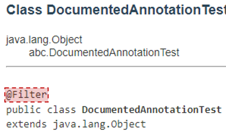 생성된 자바독 문서에서 DocumentedAnnotationTest 문서를 찾아보면 아래와 같이 @Filter 애노테이션을 확인할 수 있습니다. 만약에 @Filter 애노테이션에 @Documented을 제외하면 자바독 문서에서 표시되지 않습니다.