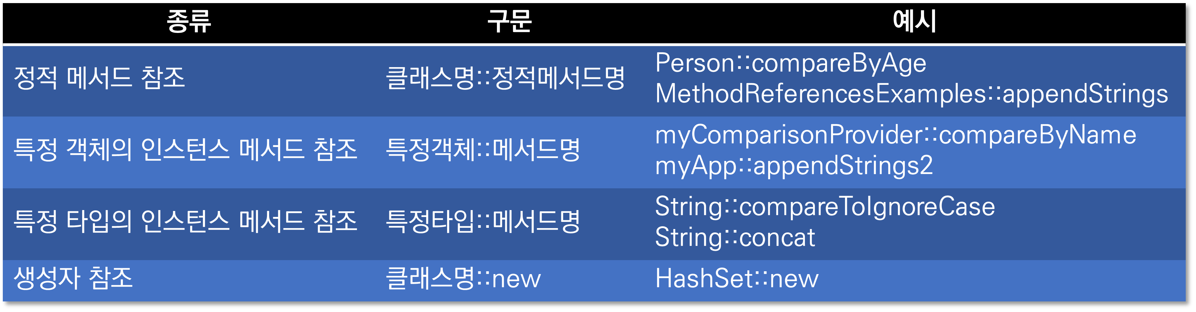 메서드 참조에는 다음과 같이 4가지 종류가 있는데, 하나하나씩 차례대로 살펴보도록 하겠습니다.
