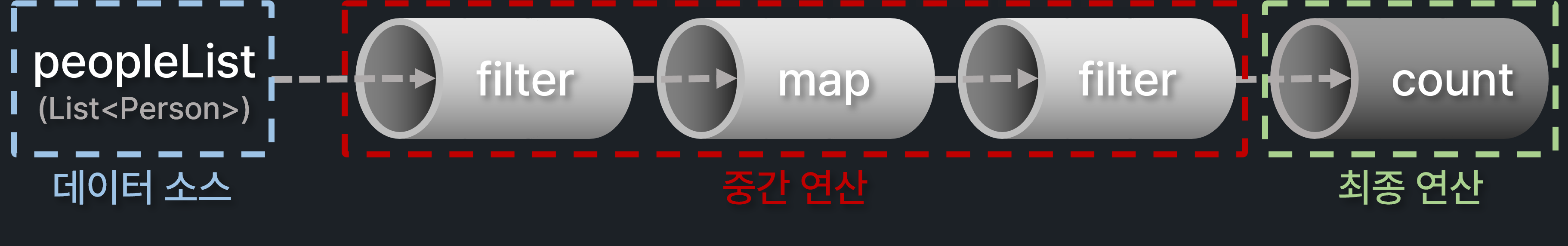 위의 예시에서 count()와 같이 스트림 파이프라인을 닫는 연산을 최종 연산(terminal operation)이라고 합니다. 최종 연산의 반환형은 스트림이 아니며 보통 List, Integer, void 등과 같은 타입의 결과를 반환합니다. count() 메서드의 경우는 long 타입의 값을 반환합니다.