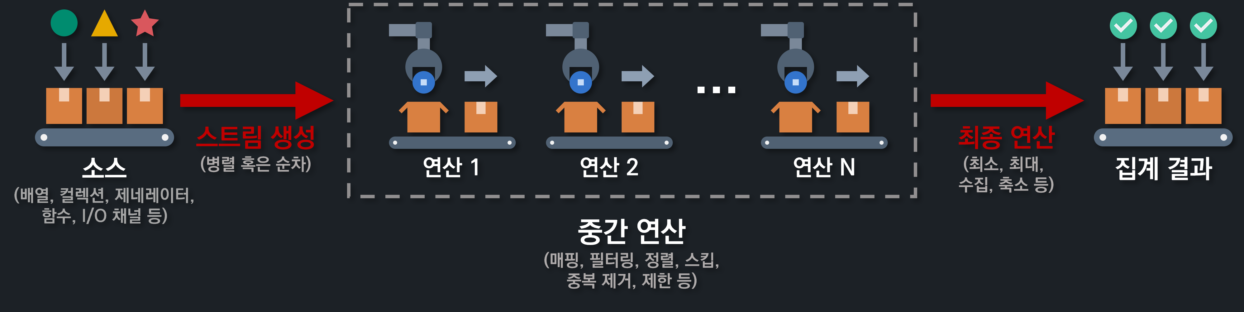 스트림(Stream)은 자바 8에서 추가된 기능입니다. 들어가기 앞서, 여기서 말하는 스트림은 입출력(I/O)에서 말하는 스트림과는 전혀 다르므로 주의합시다. 스트림을 간단하게 정의하면 "순차 및 병렬로 이루어지는 집계 연산을 지원하기 위해서 소스에서 추출된 일련의 요소"를 말합니다. 이해하기 쉽도록 각각을 분해해봅시다. 아래는 대략적인 스트림의 흐름을 나타낸 그림입니다.