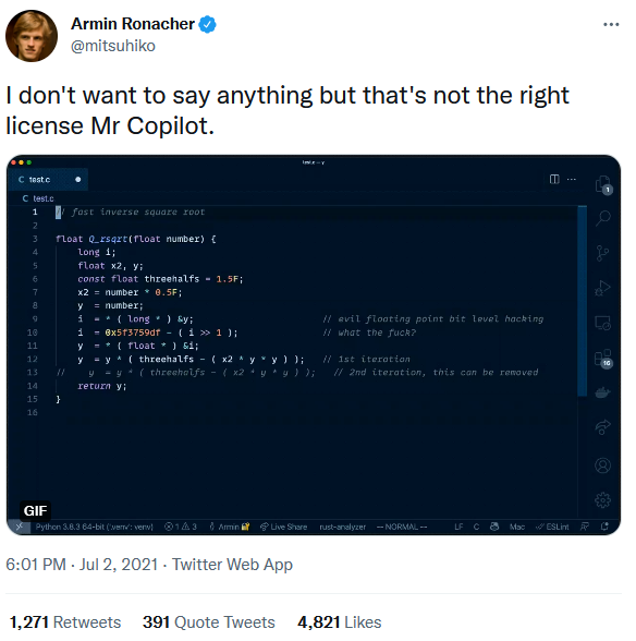 예를 들어서, 아래에서 플라스크를 개발한 아르민 로나허(Armin Ronacher)가 게시한 트윗을 살펴보면 코파일러가 퀘이크 3 아레나(퀘이크가 사용하는 라이선스는 GPLv2)에 쓰인 고속 역 제곱근 알고리즘 코드를 그대로 생성한 뒤, 이어서 잘못된 저작권자 이름이 들어간 BSD2 라이선스 정보를 그대로 붙여넣는 것을 볼 수 있습니다(아래 이미지를 누르면 해당 트윗으로 이동함).