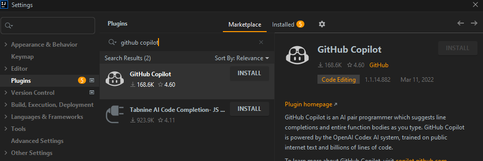 JetBrains의 마켓플레이스로 들어가기 위해서 'File > Settings(Ctrl+Alt+S)'를 눌러 Plugins에서 'github copilot'을 검색합니다. 설치 버튼을 누른 뒤 설치가 완료되면 IDE를 재시작합니다. 만약에 '서드파티 플러그인 개인정보처리방침(Third-Party Plugins Privacy Notice)'이 나온다면 이에 동의해야 사용할 수 있습니다.