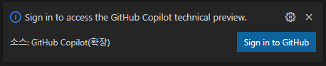 그 후 코파일럿 테크니컬 프리뷰를 이용하기 위해서 Github에 로그인을 해야 하는데, 아래의 화면에서 'Sign in to Github'을 눌러 로그인한 후에 권한 허가 요청 페이지가 등장하면 허가를 누르시기 바랍니다. 그리고 '확장으로 URI를 열 수 있도록 허용하시겠습니까?'라는 창이 나타나면 열기 혹은 허용을 누르시면 됩니다.