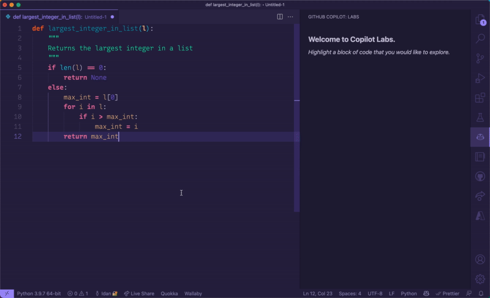 예를 들어서, Github Copilot Labs 확장을 사용하면 위에서 보는 바와 같이 궁금한 코드를 선택하여 코파일럿에게 설명해달라고 요구할 수도 있습니다. 예시 코드를 생성하거나 선택한 코드를 다른 언어로 번역하는 기능도 있으나 아직 완전하지는 않은 것 같습니다.