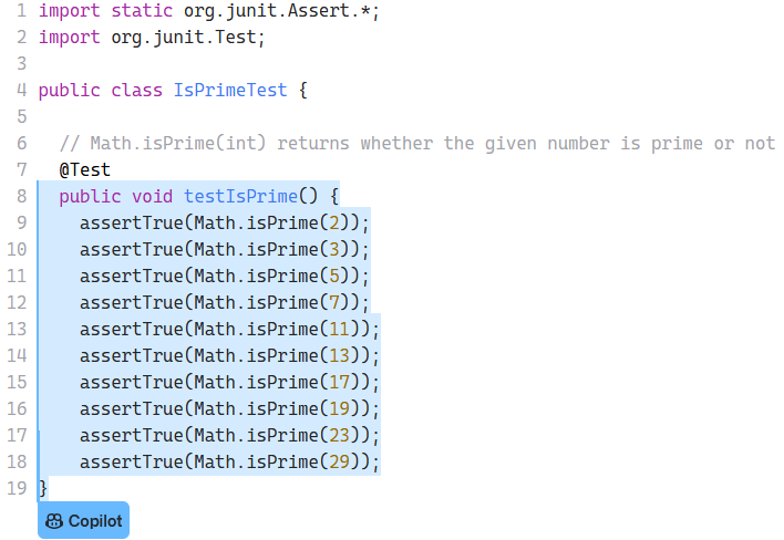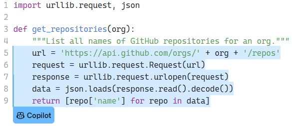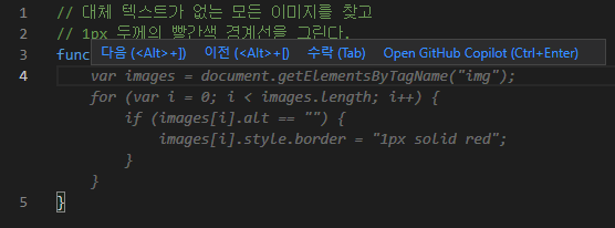 - 코파일럿이 제안한 코드를 수락하기: Tab
