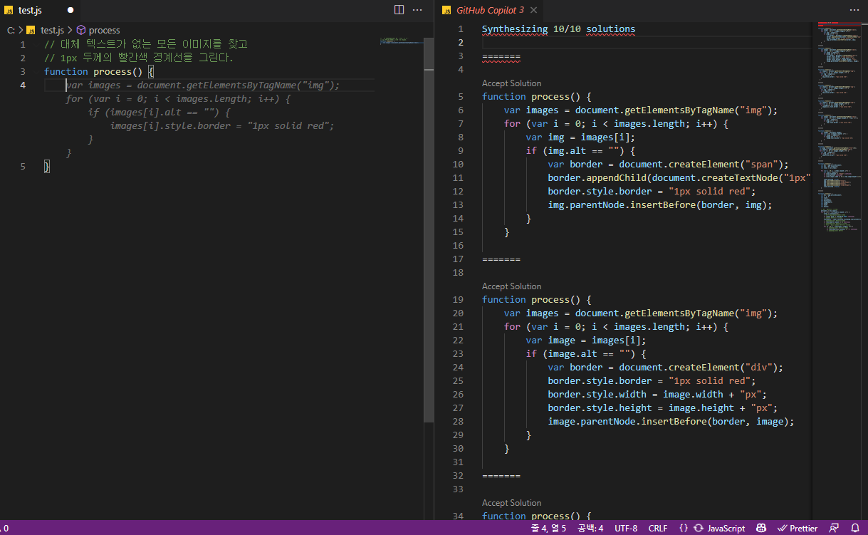 여기서 Ctrl+Enter를 누르면 분할된 화면에서 코파일럿이 제안한 코드를 최대 10개까지 한 눈에 살펴볼 수 있습니다. 'Accept Solution'을 누르면 해당 코드가 삽입됩니다.