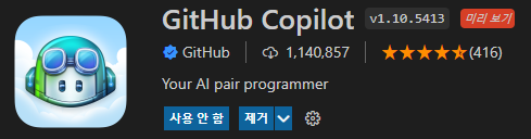 설치가 끝나면 Visual Studio Code 창 하단에 있는 상태 패널에서 코파일럿 아이콘을 확인할 수 있습니다. 이 상태 아이콘을 눌러 코파일럿을 전체적으로 비활성화 시킬 것인지 현재 사용하고 있는 언어만 비활성화 시킬 것인지 정할 수 있습니다.