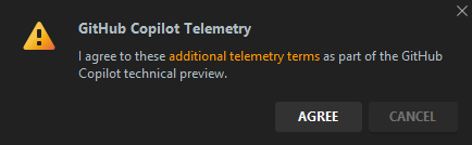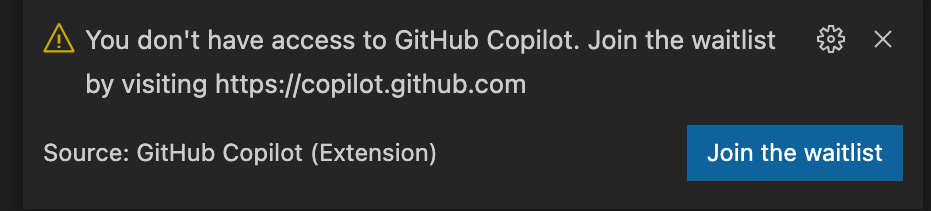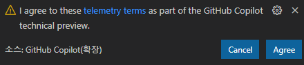 만약에 아래의 경고 메시지가 나타난다면 Github Copilot의 테크니컬 프리뷰 대기자 명단에 아직 추가되지 않은 것입니다. 테크니컬 프리뷰 기간 동안에는 대기자 명단에 들어가있는 선발된 테스터들만 사용할 수 있습니다. 대기자 명단에 등록하려면 이곳을 방문해야 합니다.
