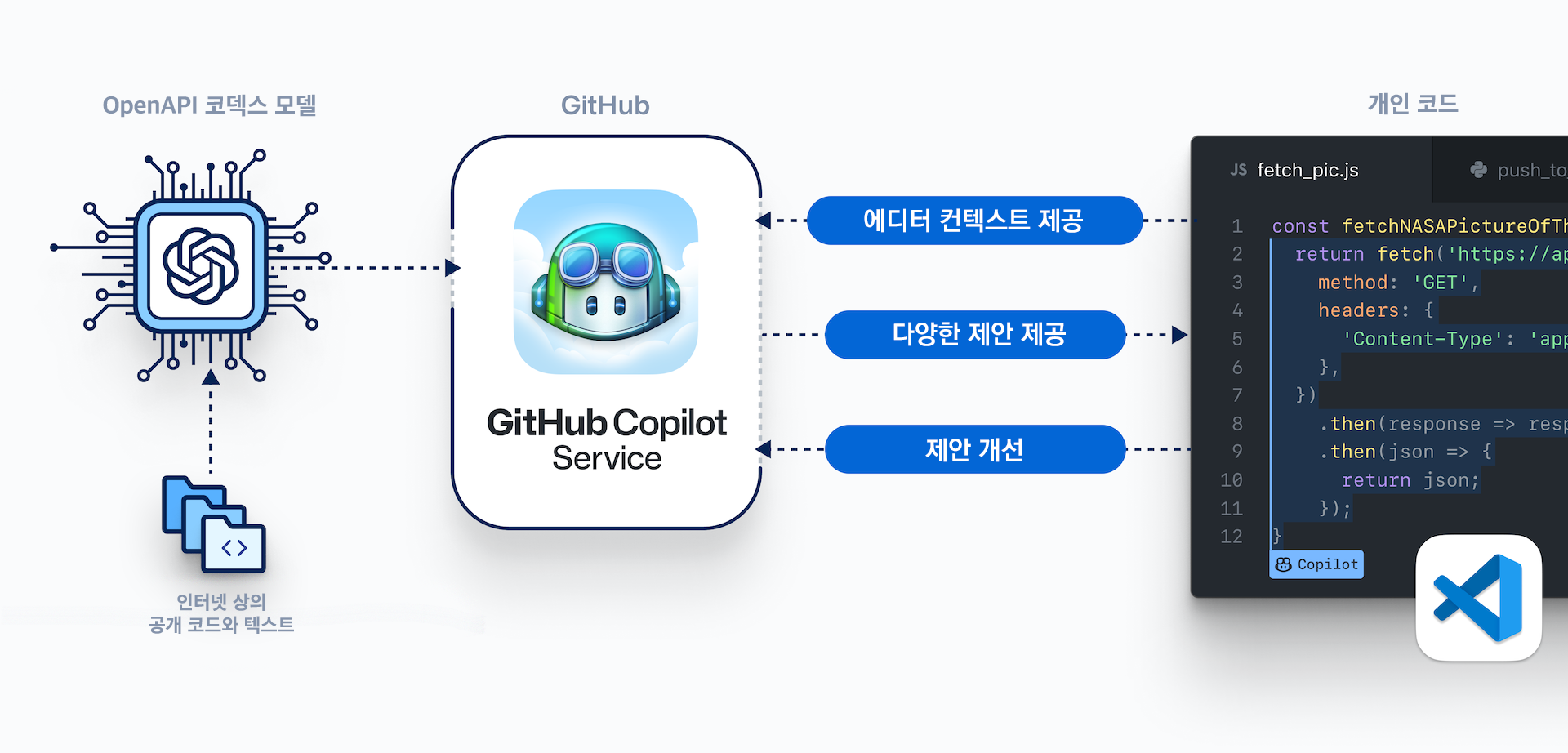 전세계의 개발자들은 오늘도 비슷한 구조의 코드를 작성하는데 많은 시간을 보내고 있습니다. 코드 편집기에서는 이를 보조하기 위해서 편의성 단축키와 스니펫, 자동 완성 등과 같이 다양한 기능들을 지원합니다. 물론 이런 기능들이 많은 도움이 되기는 하지만, 여전히 반복되는 구조의 코드를 작성하는데 많은 시간이 들어가는 것이 사실입니다. 하지만 코드의 맥락을 읽고 그 뒤에 이어질 수 있는 여러 코드들을 제안할 수 있다면 얼마나 좋을까요? 바로 Github Copilot(이하 코파일럿)이 그런 기능을 제공합니다.