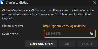 그러면 아래와 같은 창이 등장할 것입니다. Github 계정을 IDE에 연결하기 위해서 웹사이트에 들어가 디바이스 코드를 입력해야 합니다. '복사 후 열기(COPY AND OPEN)'을 눌러 Github 사이트에 들어갑니다. 디바이스 코드를 붙여넣은 뒤 'Continue' 버튼을 누릅니다. 그 후 코파일럿이 사용자를 대신해서 코드를 작성할 수 있도록 권한을 요청하는데 'Authorize Github Copilot Plugin' 버튼을 눌러 권한 요청을 허가합니다.