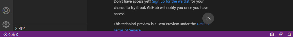만약에 아래의 경고 메시지가 나타난다면 Github Copilot의 테크니컬 프리뷰 대기자 명단에 아직 추가되지 않은 것입니다. 테크니컬 프리뷰 기간 동안에는 대기자 명단에 들어가있는 선발된 테스터들만 사용할 수 있습니다. 대기자 명단에 등록하려면 이곳을 방문해야 합니다.