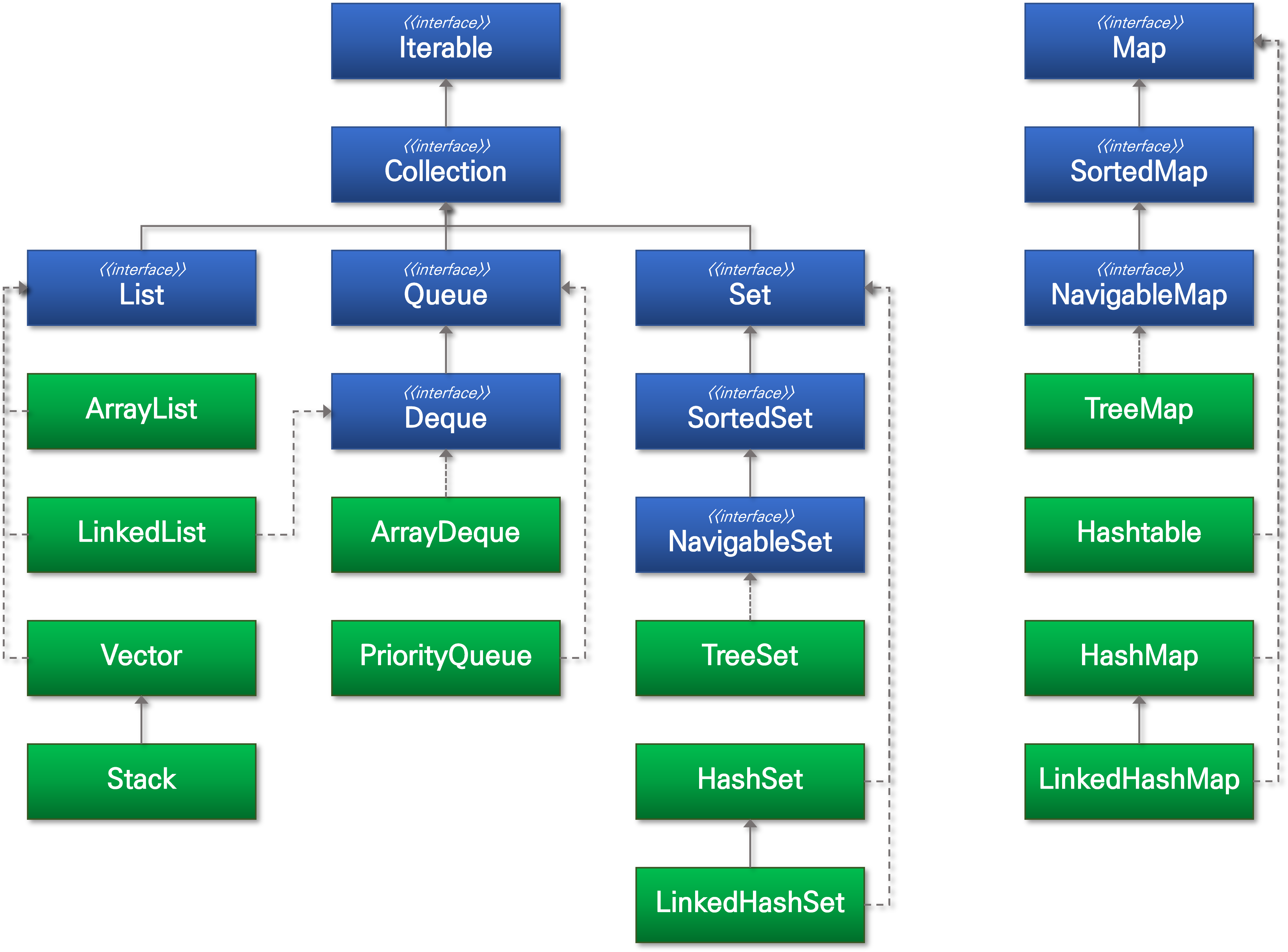 자바에서 컬렉션(collection)은 여러 개의 요소를 묶어서 하나로 만든 그룹 객체(혹은 컨테이너)를 말합니다. 자바에서는 아래 다이어그램에서 볼 수 있듯이 컬렉션을 다루기 편하도록 컬렉션 프레임워크(collections framework)라는 통합된 하나의 구조로 만들었는데, 이로 인해서 API의 일관성을 통해 개발자들이 학습하기 쉽고, 설계 시 확장이 용이하며, 기존에 만들어진 알고리즘을 재사용 할 수 있게 되었습니다.