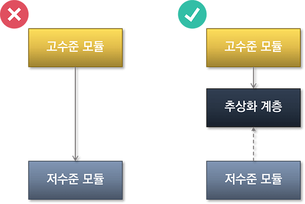 저수준 클래스는 고수준 클래스의 작업을 돕는 작은 클래스라고 할 수 있습니다. 보통은 파일 입출력, 데이터베이스 통신 같은 기술적인 부분을 다루는 저수준 클래스를 먼저 작성하고, 이런 저수준 클래스들을 사용해 현실 세계에서 유용한 비즈니스적인 부분을 다루는 고수준 클래스를 작성합니다. 고수준 클래스가 저수준 클래스를 사용하므로 고수준 클래스가 저수준 클래스에 의존하는 것이 자연스러워 보이지만, 저수준 클래스는 빈번하게 변경되고 추가될 때마다 고수준 클래스가 영향을 받기 쉬우므로 의존관계를 역전시켜야 합니다. 의존이 무엇인지는 곧 이어서 살펴볼 것입니다.