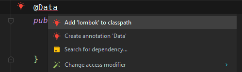여기서는 IntelliJ 위주로 살펴보므로, 최신 정보나 IntelliJ가 아닌 다른 IDE에서는 어떻게 설치하는지 알고 싶다면 공식 홈페이지에서 확인해보세요. IntelliJ 같은 경우는 2020.3 버전부터 롬복 플러그인이 내장되어 있어서 별도로 설정해줄 것이 없습니다. 의존성 설정은 직접 해도 되지만 아래와 같이 Alt+Enter를 눌러서 Context Actions에서 롬복(lombok)을 간단하게 클래스패스에 추가할 수도 있습니다.