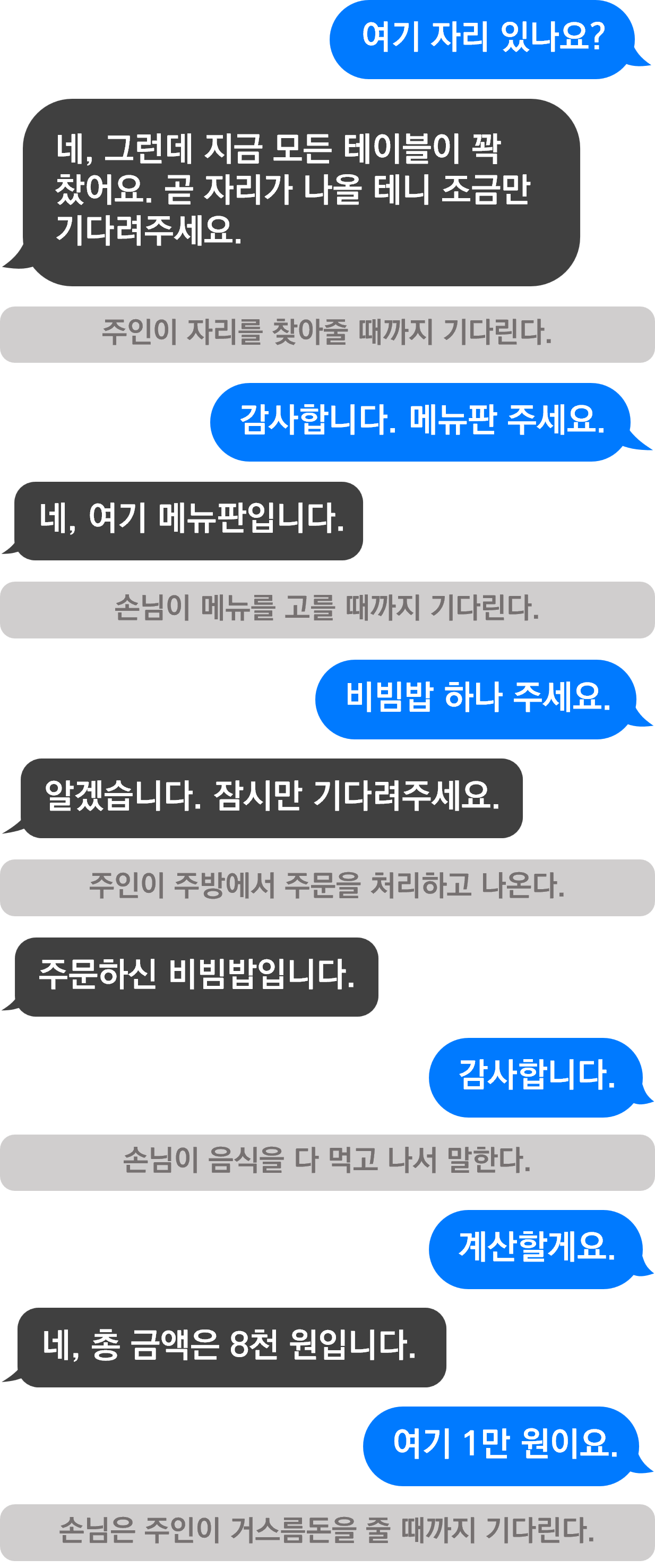 예를 들어서 아래와 같은 상황을 생각해봅시다. 여기에서는 손님이 자리를 찾고, 메뉴를 고르고, 음식을 주문하고, 계산을 하는 동기적인 상황을 보여주고 있습니다. 손님은 주인이 자리를 찾아주거나 주문을 처리하는 등의 일을 처리할 때까지 기다리며 다른 일을 하지 않습니다.