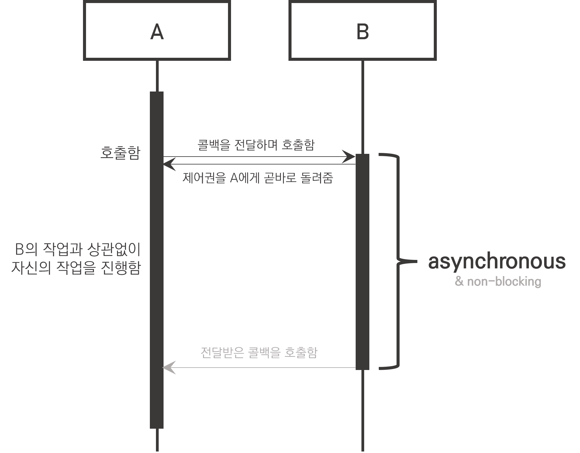 비동기(asynchronous)에서는 순서가 흐트러질 수 있으며 엄격한 순서를 따를 필요가 없습니다. 다시 말해서 별도의 시작 시간과 종료 시간을 가질 수 있다는 말이며, 여기서는 처리해야 할 작업이 완료되었는지 완료되지 않았는지는 크게 관심이 없습니다. 작업이 완료됐다는 사실은 콜백을 호출하거나 인터럽트를 걸거나 하는 것과 같이 별도의 알림을 보내줌으로써 알려주게 됩니다.