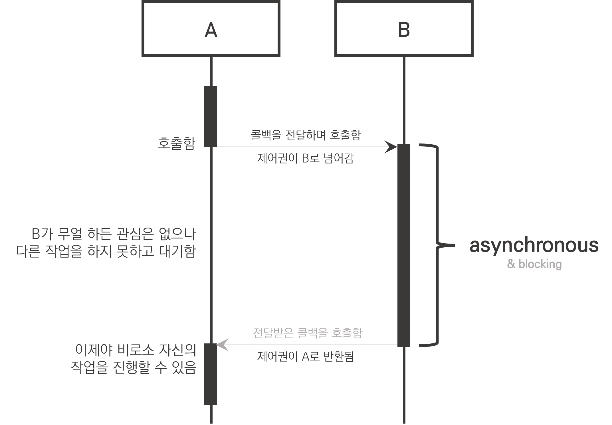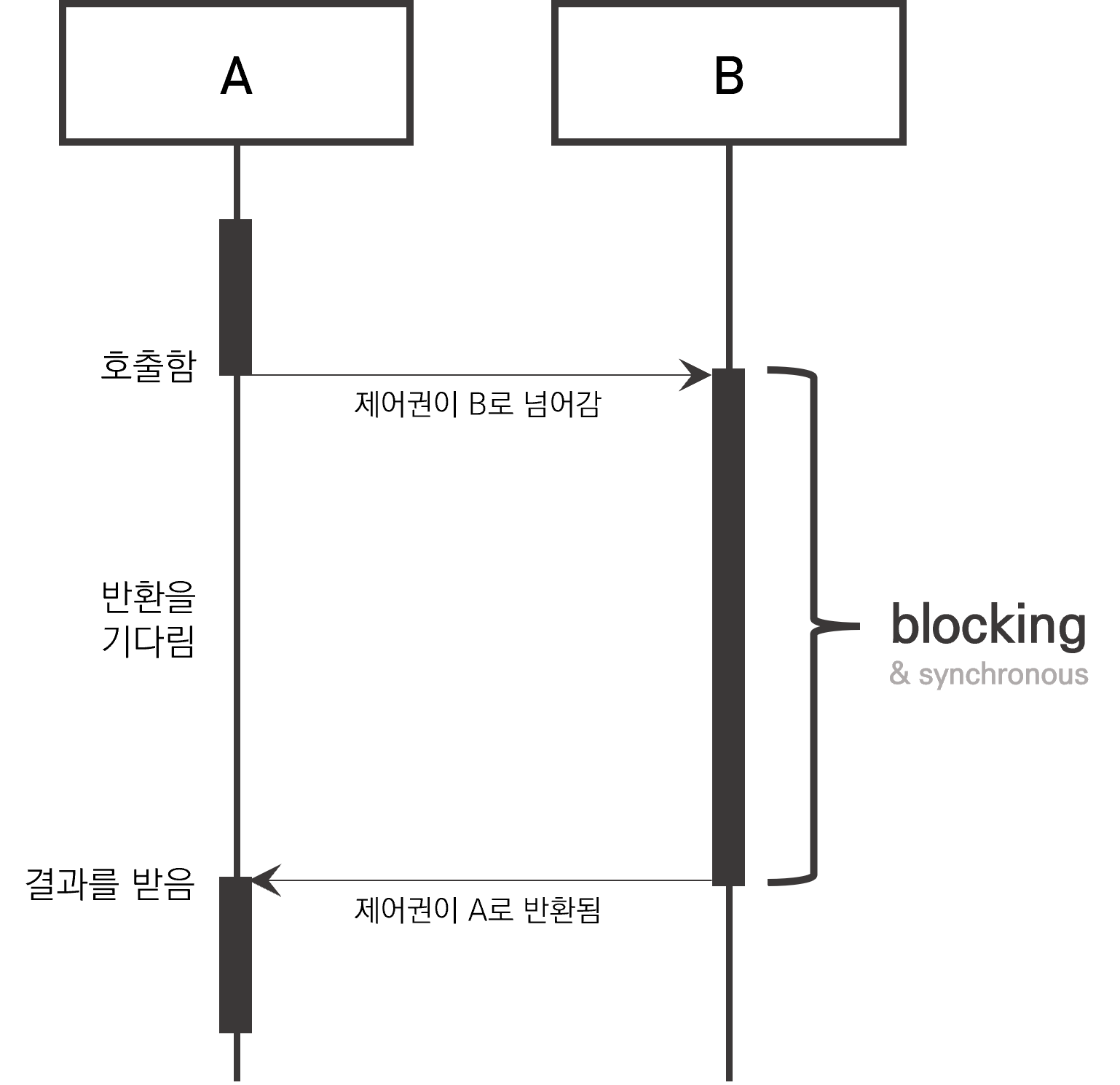 좀 더 프로그래머의 관점으로 끌어들이면, 어떤 메서드를 호출하고 제어권이 자신에게 곧바로 돌아오는지 아닌지에 따라 블로킹이 발생할 수 있습니다. 만약 메서드가 실행 중에 다른 메서드를 호출하고, 호출된 메서드에서 다른 작업을 수행하지 못하고 제어권이 반환될 때까지 기다려야 한다면 블로킹이 발생한다고 할 수 있습니다.
