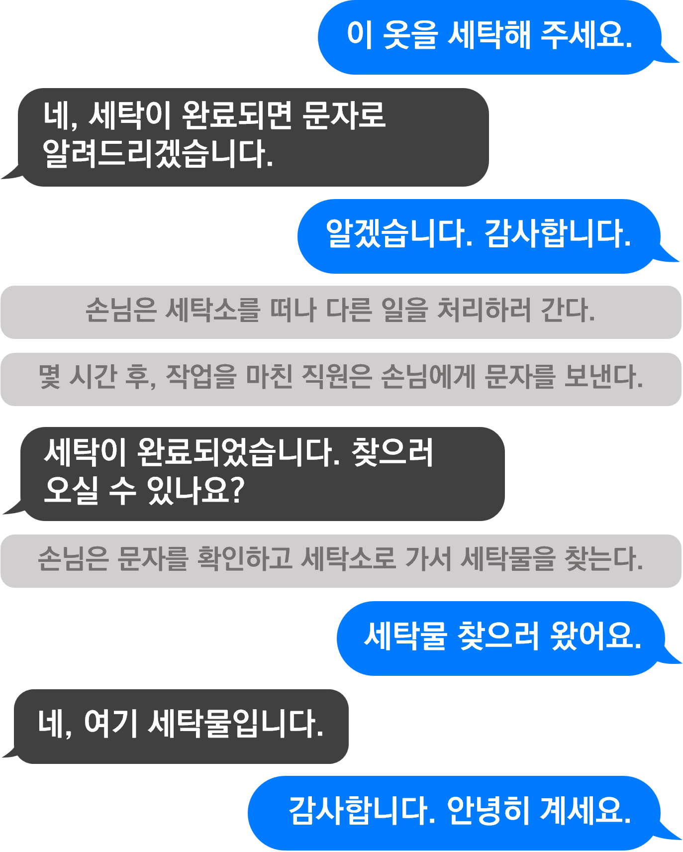 아래 상황을 예시로 들어봅시다. 이 상황에서는 손님이 세탁소에 세탁물을 맡기고, 직원이 세탁 작업을 완료할 때까지 기다리지 않고 다른 일을 계속 진행하는 비동기적인 상황을 보여줍니다. 손님은 현재 세탁소 직원이 세탁을 모두 끝냈는지에 대해서는 크게 관심이 없습니다. 손님은 세탁 작업이 완료되는 동안 다른 일을 처리하고, 세탁물이 준비되면 문자 알림을 통해서 알게 됩니다. 손님이 문자를 확인하고 바로 세탁물을 가지러 가거나, 바쁜 상황이라 문자(콜백)를 확인하지 않고 다른 일을 계속 처리할 수도 있습니다.