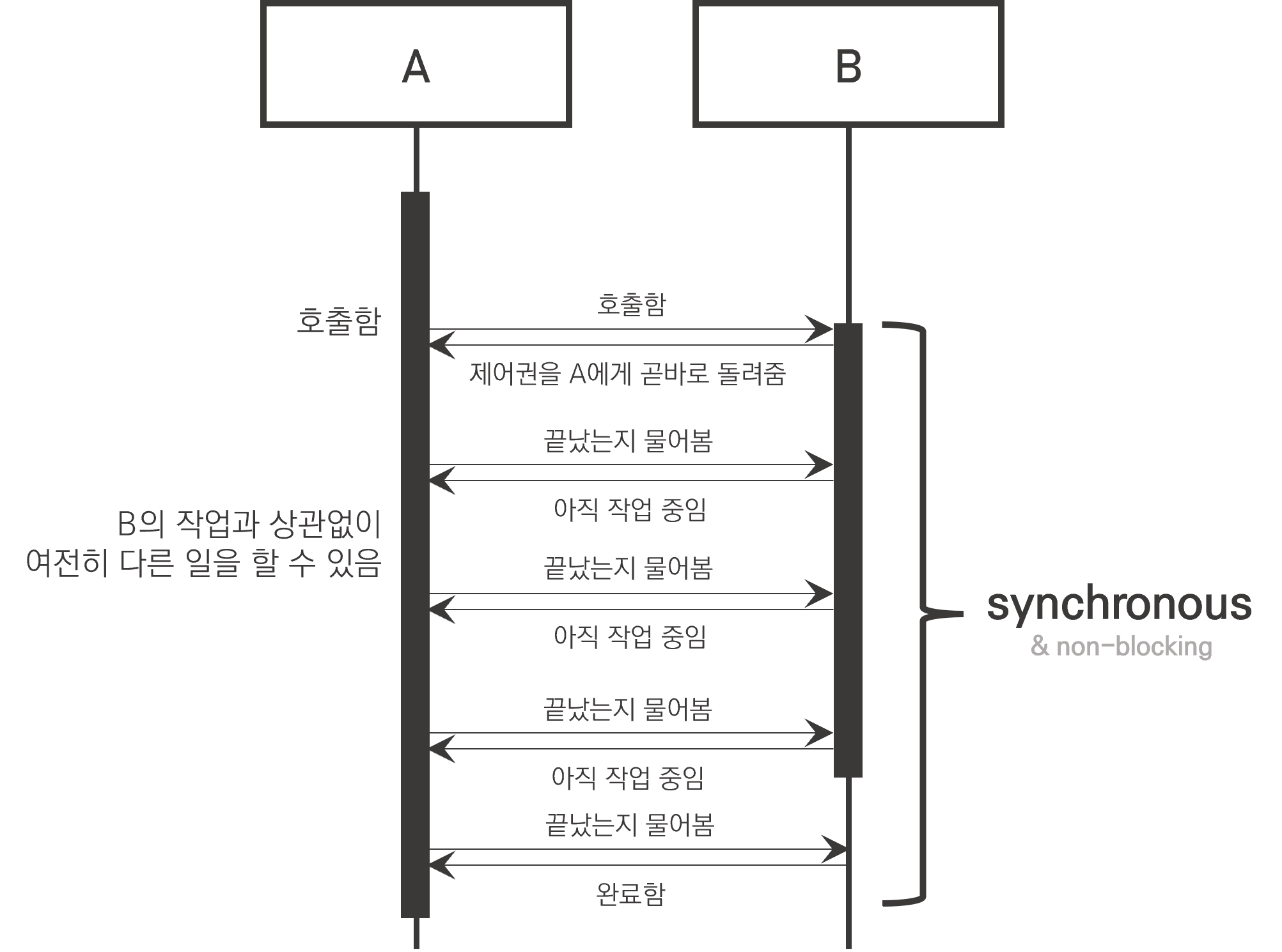 아래는 동기와 논블로킹의 조합을 보여주는 예시입니다. 다른 스레드의 작업을 모두 마칠 때까지 계속 끝났는지 물어보지만, 제어권을 바로 돌려받으면서 여전히 다른 일을 할 수 있는 것을 볼 수 있습니다.