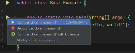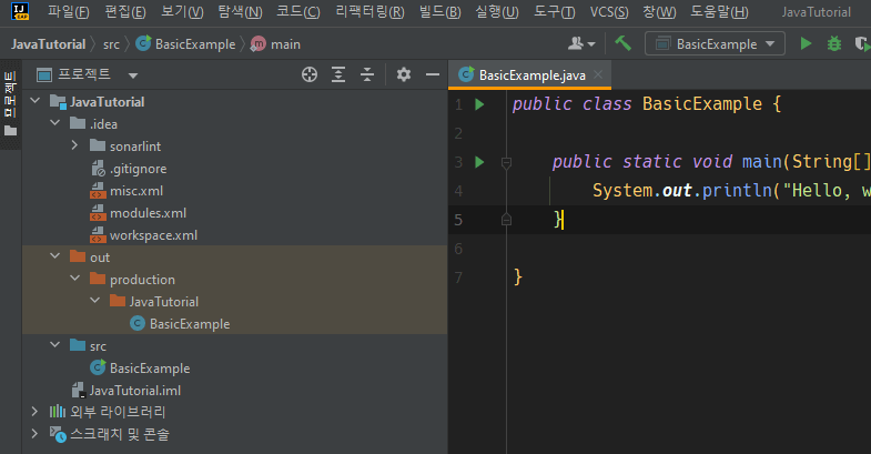모두 다 작성하셨으면 'Run -> Run'이나 단축키 Ctrl+Shift+F10을 눌러 프로그램을 실행해봅시다. main() 메서드 옆에 있는 초록색 재생 버튼 아이콘을 눌러서 "Run 'BasicExample.main()'"을 누르셔도 됩니다.