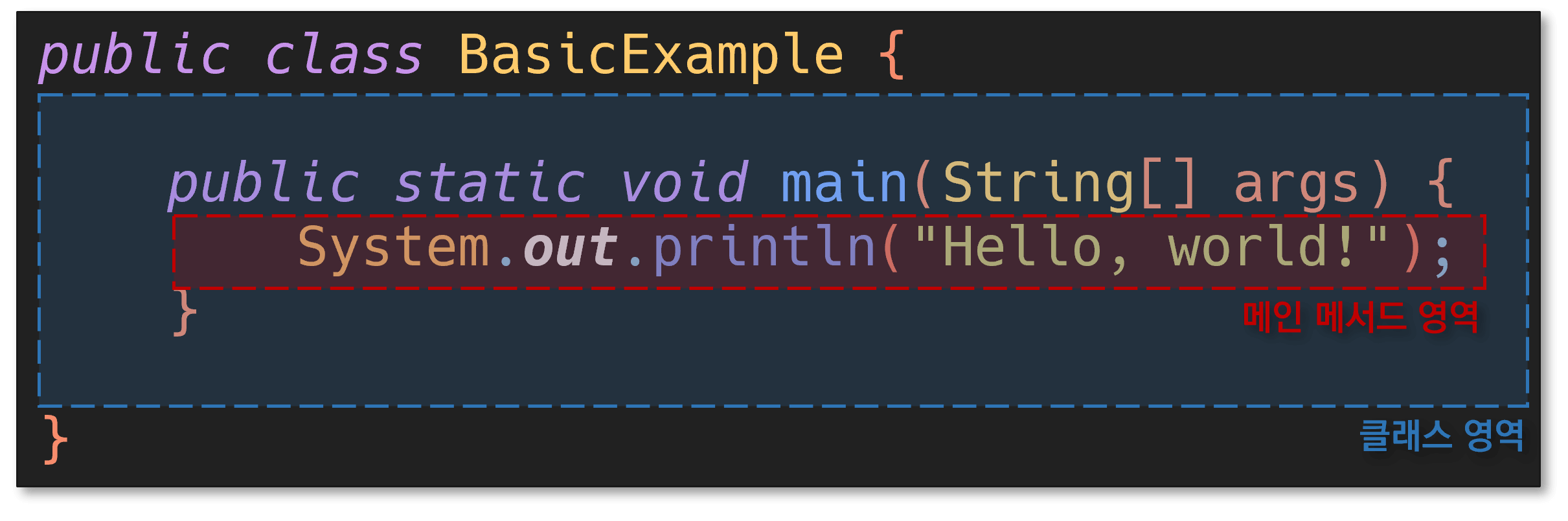 이어서 중괄호 { }가 나타나는데 이것은 코드 영역을 구분지어주는 역할을 합니다. 따라서 1행에서 7행까지는 BasicExample 클래스의 영역이고 3행에서 5행까지는 메인 메서드의 영역이 됩니다. 이렇게 구분지어진 영역을 우리는 블록이라 부르고, 이 블록은 {로 시작하여 반드시 }로 끝나야 합니다.