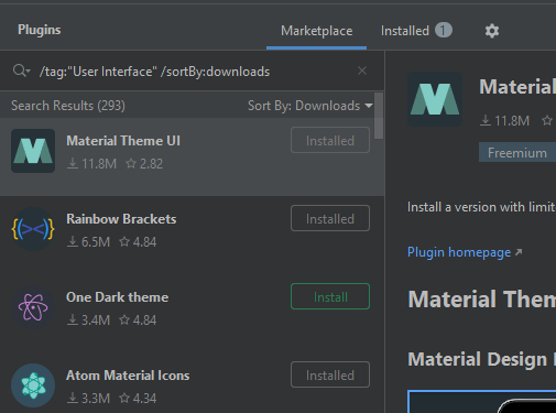물론 플러그인도 추가할 수 있습니다. 단축키 Ctrl+Alt+S를 누르거나, File > Settings로 들어가서 설정 창을 엽시다. 그 후에 Plugins을 누르고 Marketplace 탭을 눌러서 자신이 원하는 플러그인을 설치할 수 있습니다. 여기서는 초반에 도움이 될만한 플러그인 위주로 소개합니다. 반드시 설치해야 하는 것은 아니며 어디까지나 선택 사항입니다.