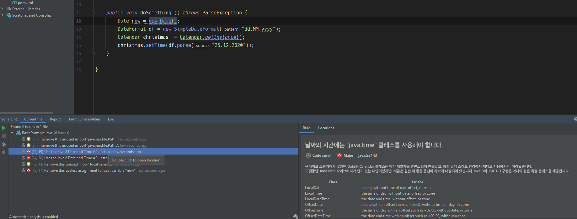 검색 창에 "sonar"라고 입력하면 검색 결과 상단에 보이는 'SonarLint'를 설치합시다. 우리가 코드를 작성할 때 코드에 있는 버그나 취약점, 코드 품질을 떨어뜨리는 잘못된 코드 등을 찾아서 표시해줍니다. 원한다면 문제가 되는 코드를 즉시 수정할 수 있으며, 왜 이게 문제가 되는 코드인지에 대한 상세한 내용을 제공해줍니다. 물론 설명은 영어로 제공되니 참고합시다.