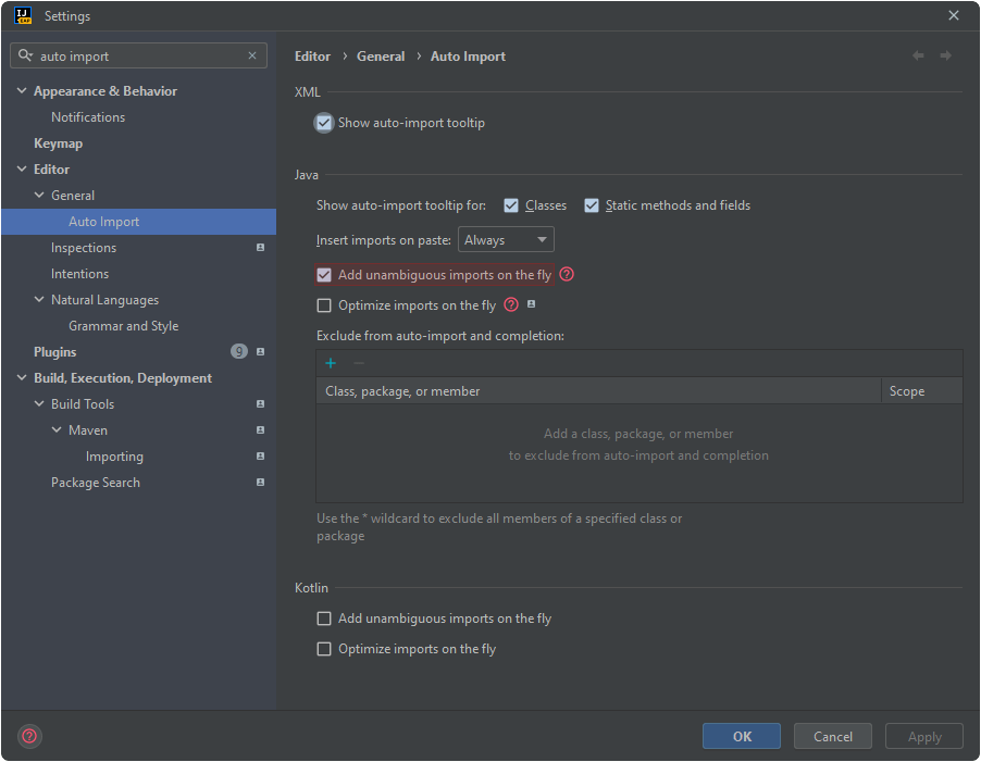 여기서 'Add unambiguous imports on the fly(모호하지 않은 import문 즉시 추가하기)'를 체크하고 오른쪽 하단의 Apply 버튼을 누른 후 OK 버튼을 누릅시다. 여기서 'Optimize imports on the fly(import문 즉시 최적화하기)'에 체크하면 사용되지 않는 import문을 자동으로 제거해주고 코드 스타일 설정에 따라서 import문을 다시 정렬해줍니다. 필요에 따라서 체크해줍시다.