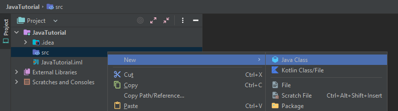 왼쪽의 프로젝트 창에 보이는 src 폴더를 우클릭하여 New > Java Class를 누르고 BasicExample 이라는 클래스를 만들어봅시다.