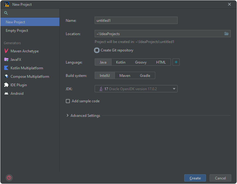 이제, 소스 코드를 직접 작성하고 간단히 구조를 살펴보도록 하겠습니다. 2편에서 다운로드 받은 개발 도구를 열어주시기 바랍니다. 여기에서는 IntelliJ IDEA를 기준으로 설명하겠습니다. 그럼 'Project > New Project'를 눌러 새 프로젝트를 만들어봅시다. 여기서 Name에는 원하는 프로젝트 이름을 입력하고 Create를 눌러 프로젝트를 생성합시다. JDK는 8 이상을 사용해주세요. 되도록이면 최신 버전일수록 좋습니다.