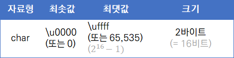 문자형인 char형에는 유니코드 문자(UTF-16) 하나를 저장할 수 있습니다. 유니코드란 전 세계의 모든 언어나 기호에 번호를 할당하여 문자를 정의하는 국제 표준 규약입니다.