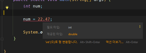 에러가 말해주는 대로 필요한 타입(혹은 형)은 정수형(int)인데 실수형(double)이 왔기 때문입니다. 에러를 없애려면 int형이 아닌 double형으로 변수를 선언해야 합니다. 이처럼 int, double 등과 같은 것들을 타입(type)이라 부르며 자바에서는 여러 가지의 타입이 존재합니다.